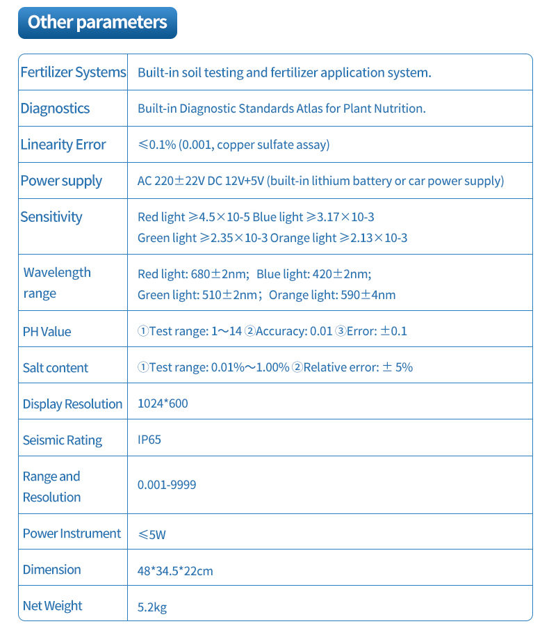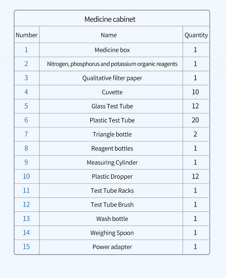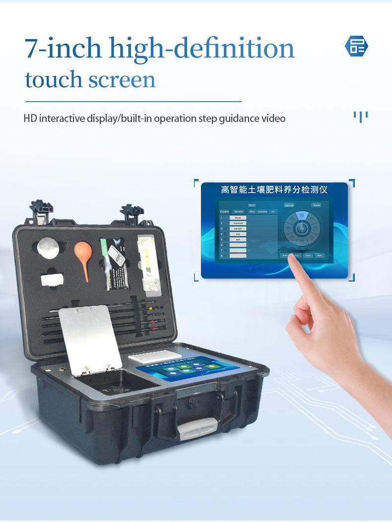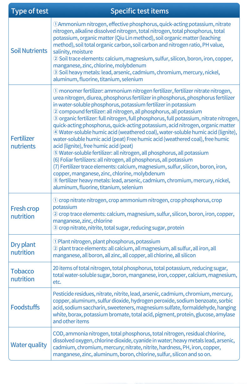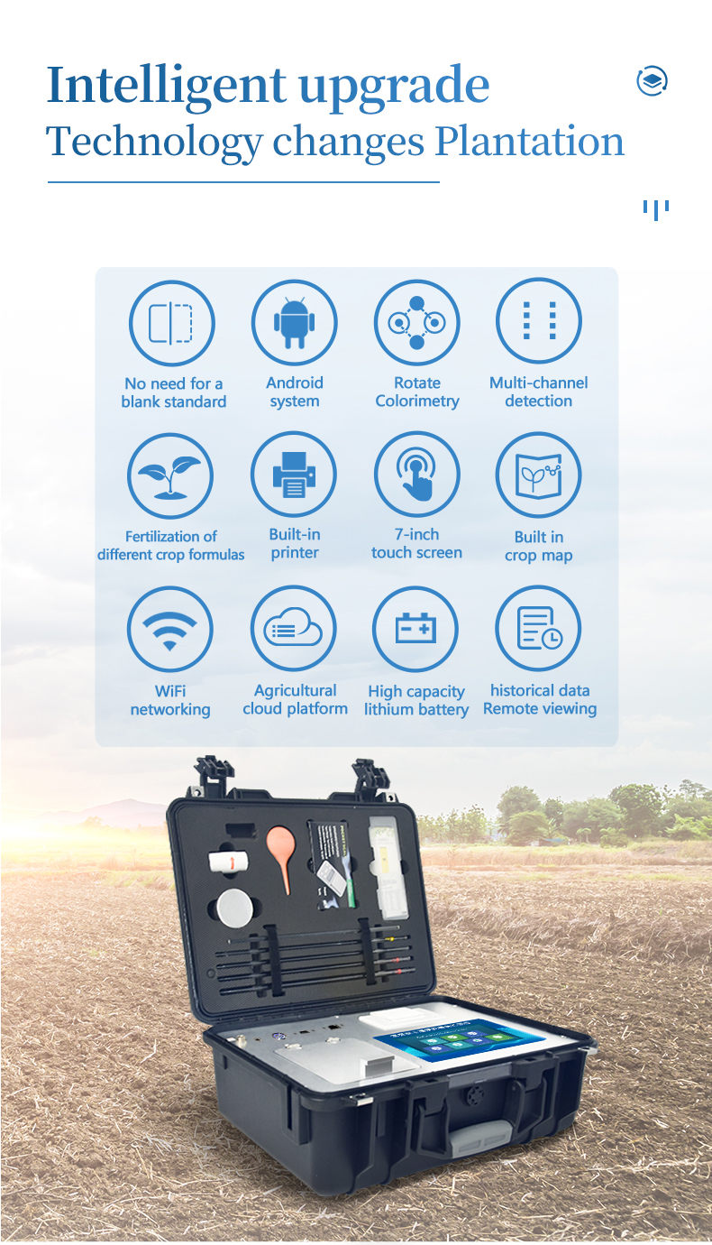 Complete supporting facilities: This instrument integrates medicine, equipment, and instruments, without the need for user provided accessories, equivalent to a small mobile laboratory, convenient to carry, and can also be used for field mobile testing. Suitable for agricultural service departments, agricultural material distributors, cooperatives, fertilizer manufacturers, and large growers to conduct soil testing and fertilization.
