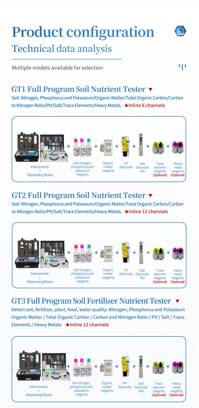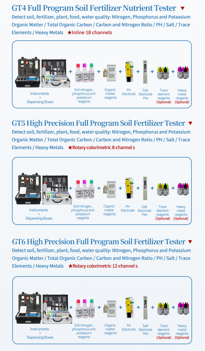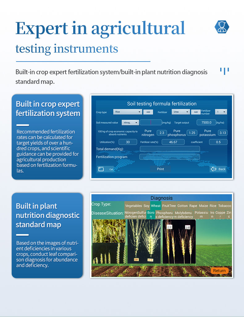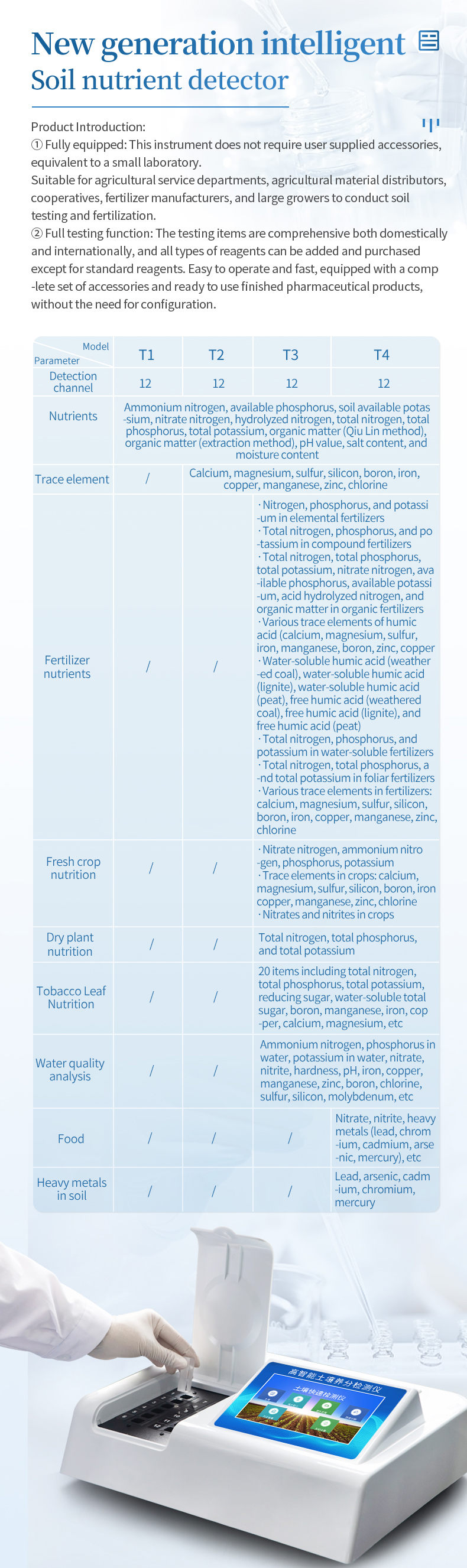 Complete supporting facilities: This instrument integrates medicine, equipment, and instruments, without the need for user provided accessories, equivalent to a small mobile laboratory, convenient to carry, and can also be used for field mobile testing. Suitable for agricultural service departments, agricultural material distributors, cooperatives, fertilizer manufacturers, and large growers to conduct soil testing and fertilization.