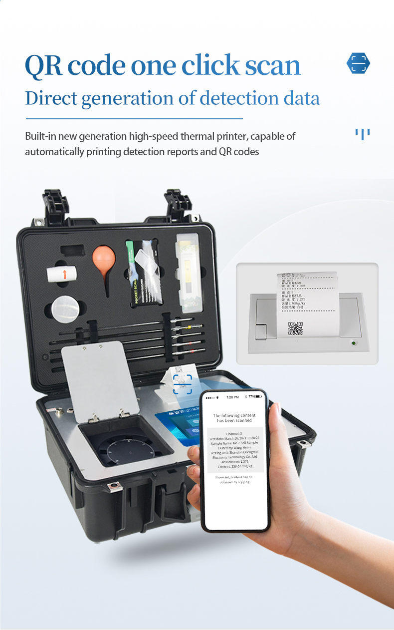 15. Equipped with a new generation of high-speed thermal printer (without ribbon), the printed content includes information such as testing unit, testing personnel, testing items, channel number, absorbance, nutrient content (mg/kg), testing time, and QR code