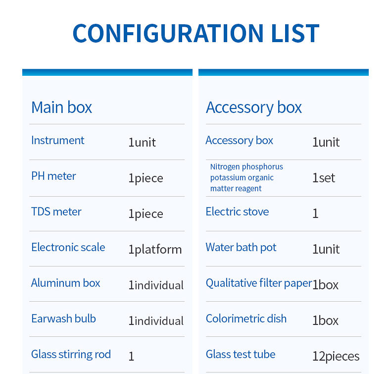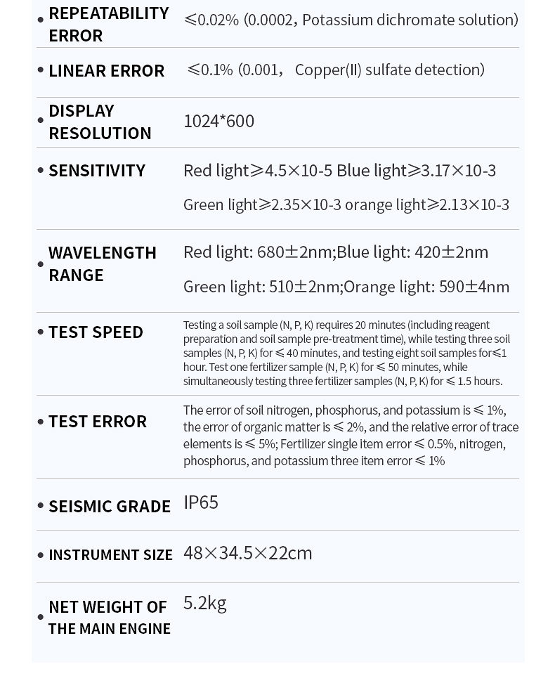 The error of soil nitrogen, phosphorus, and potassium is ≤ 1%, the error of organic matter is ≤ 2%, and the relative error of trace elements is ≤ 5%; The single error of fertilizer is ≤ 0.5%, and the error of nitrogen, phosphorus, and potassium is ≤ 1%.