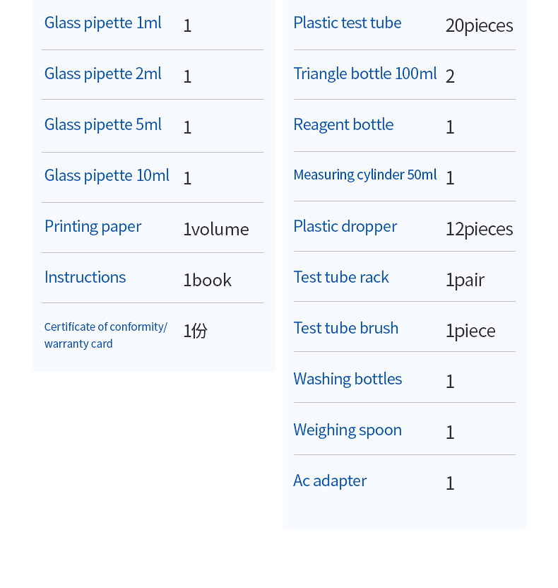 9. PH value (pH): (1) Test range: 1-14 (2) Accuracy: 0.01 (3) Error: ± 0.1