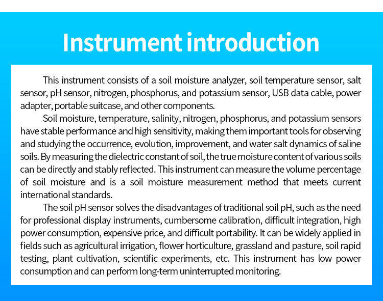 The soil moisture analyzer adopts the FDR frequency domain reflection principle to quickly and accurately measure the moisture content in soil. It can quickly detect and continuously monitor the moisture content in multiple sample plots and different soil depths for a long time. Widely used in soil moisture detection, dryland water-saving irrigation, precision agriculture, forestry, geological exploration, plant cultivation and other fields.